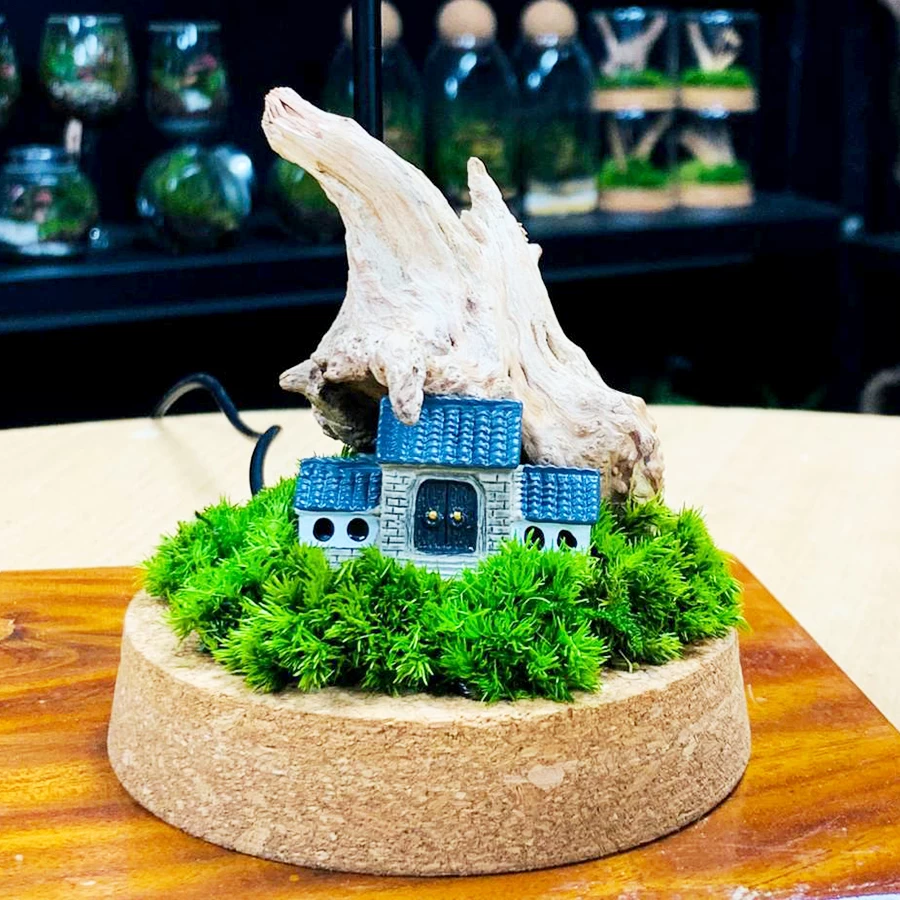 décor piece featuring a miniature house set on a lush preserved moss landscape